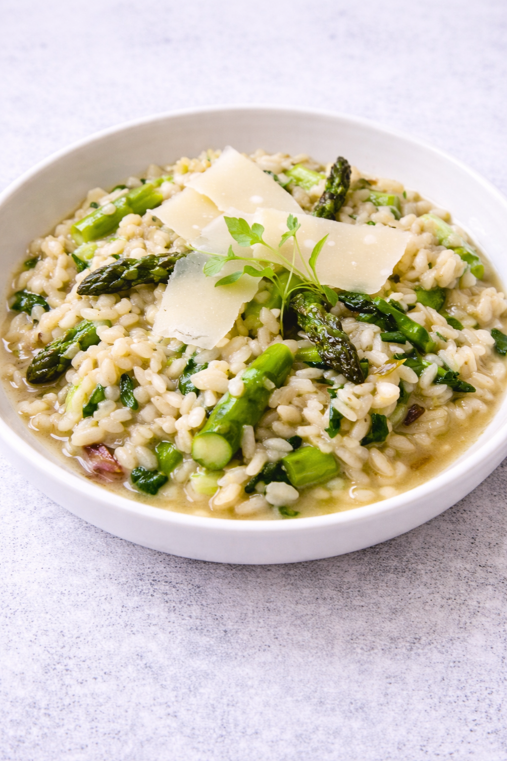 Asparagus pairs exceptionally well with fresh herbs, lemon zest, Parmigiano‑Reggiano, and seasonal greens like ramps or peas. A squeeze of lemon brightens the dish further, while the cheese adds richness. You can also serve this risotto alongside grilled chicken, fish, or a crisp salad.