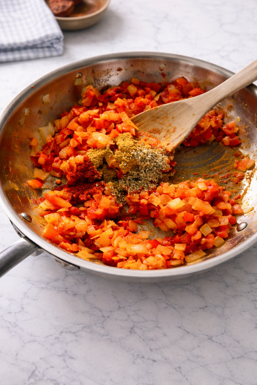 Mix in the tomato paste, apple cider vinegar, adobo sauce, and minced garlic. Stir well and cook for about a minute, until fragrant and the tomato paste darkens slightly. Sprinkle in the cumin, smoked paprika, dried oregano, and tomatoes, stirring to evenly distribute the spices.