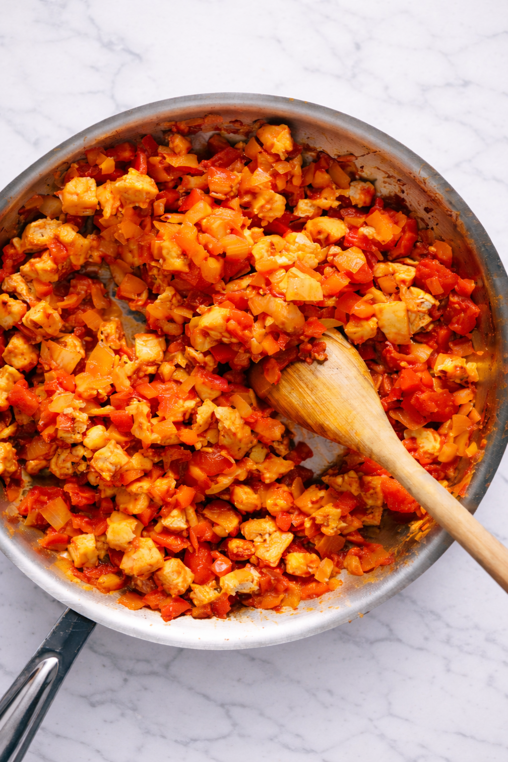 Add the diced tomatoes and continue cooking until the bell peppers are tender and easily pierced with a fork, about 2 to 3 minutes. Return the tofu to the skillet and stir thoroughly to coat it in the sauce. Cook for another minute, allowing the flavors to meld and the tofu to absorb some of the sauce.